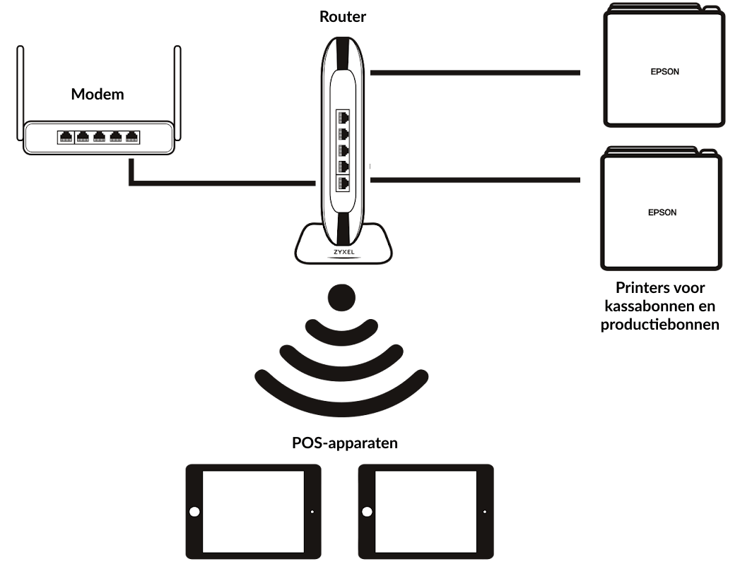 - Printers voor kassabonnen en bestelbonnen: Via ethernetkabel verbonden met dezelfde router als de POS-apparaten.
