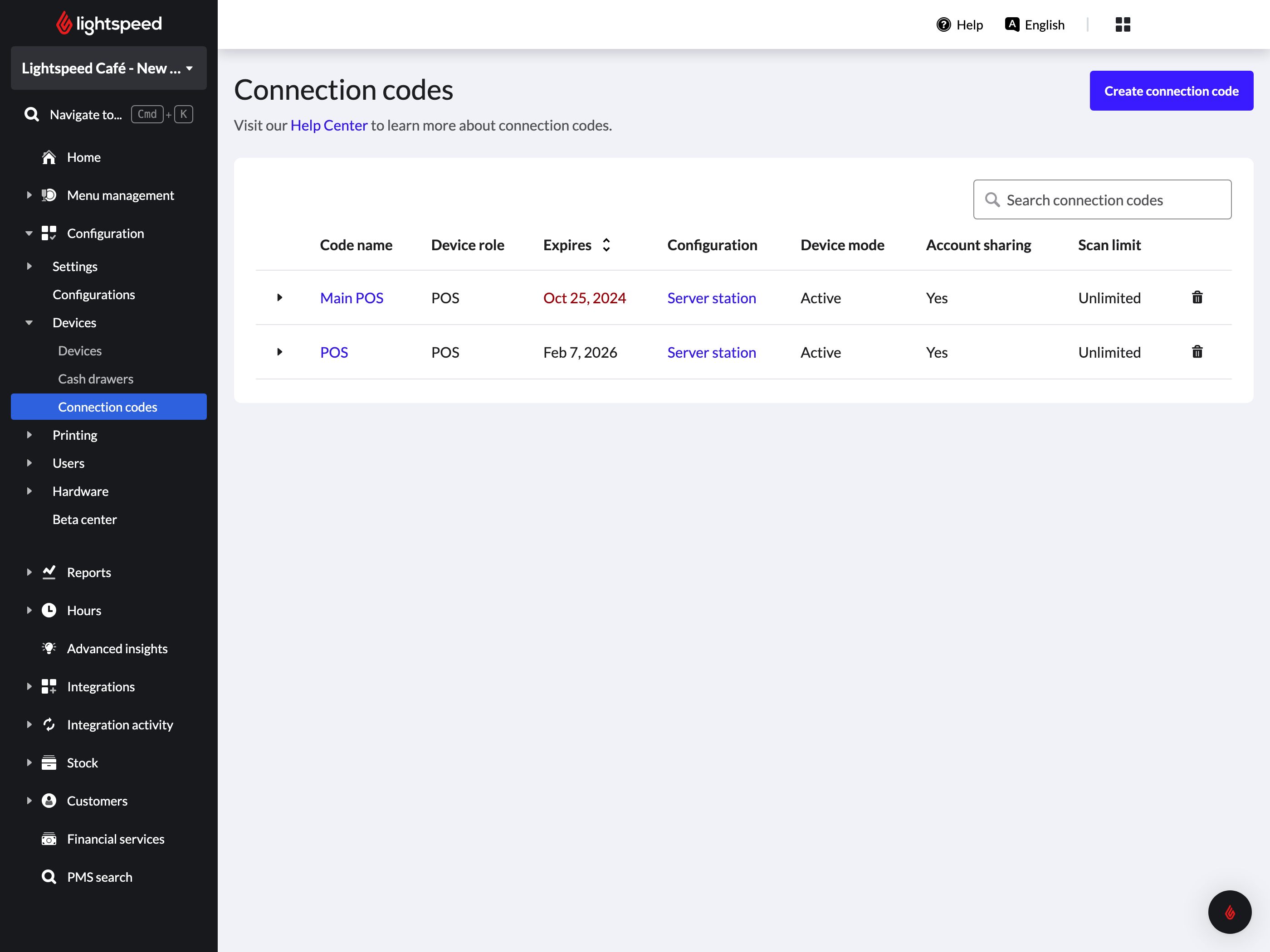 Als je de Lightspeed Restaurant POS-app wilt activeren of erbij wilt inloggen op je iPhone of iPad, moet je een connectiecode aanmaken in de backoffice. Een connectiecode is een unieke, beveiligde en scanbare referentie die wordt gebruikt om voor de eerste keer in te loggen bij de Lightspeed Restaurant-app. Je bedrijf heeft mogelijk meerdere connectiecodes nodig, afhankelijk van je POS-configuratie, gebruikers en het aantal apparaten dat je configureert.