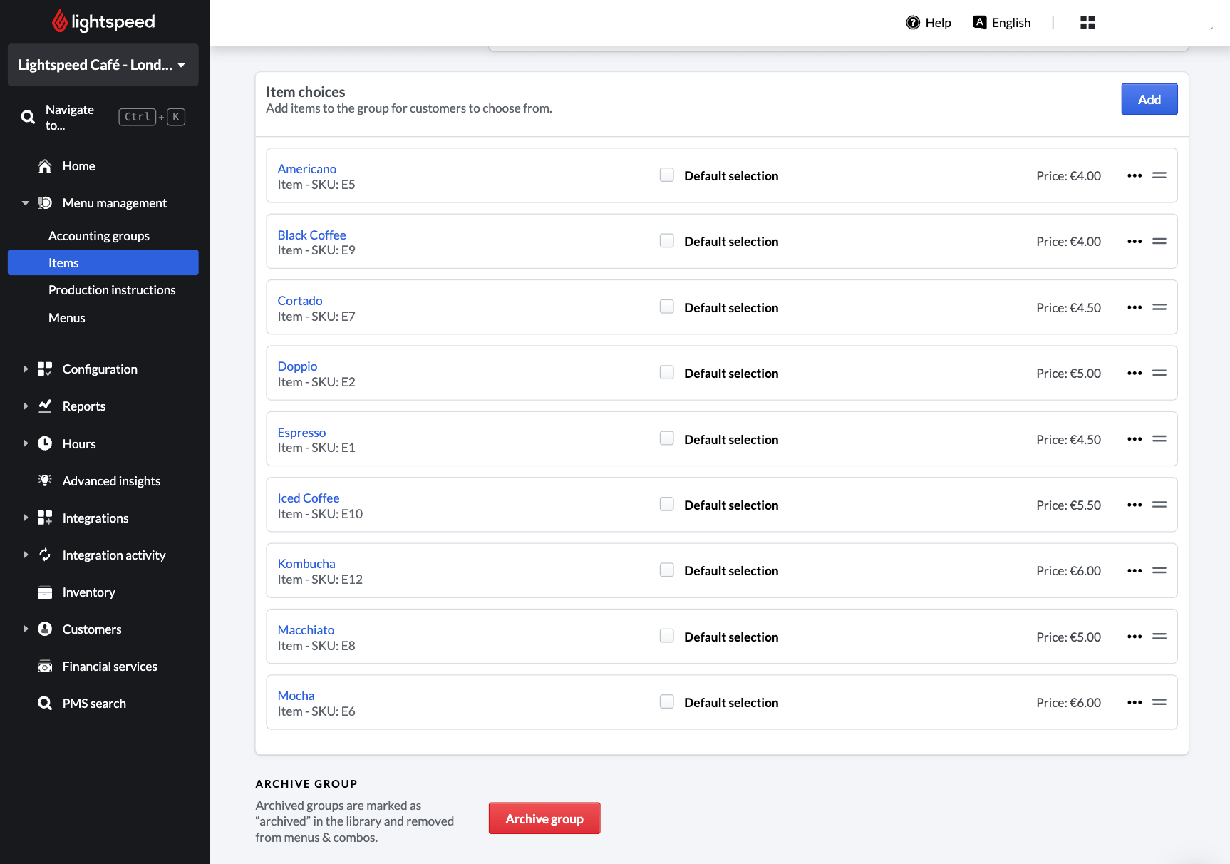 Itemkeuzes: Klik op Toevoegen om items aan de groep toe te voegen. Dit zijn de opties die beschikbaar zijn op de POS wanneer je een keuze maakt uit de itemgroep. In de pop-up kun je items toevoegen, nieuwe items aanmaken en specifieke items zoeken met behulp van het filtertekstvak. Om tijd te besparen, kun je een Standaardselectie voor de groep selecteren die automatisch geselecteerd wordt op de POS wanneer er voor de groep gekozen wordt. Dit is vooral handig wanneer één optie aanzienlijk populairder is dan andere opties, bijvoorbeeld frietjes als bijgerecht bij een hamburgercombo.