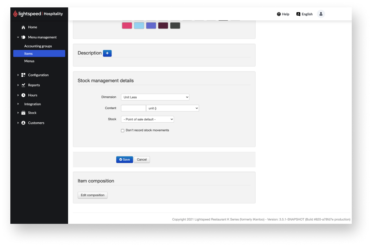 Bij het toevoegen van een item aan de backoffice zijn er twee secties die betrekking hebben op de voorraad: Informatie voorraadbeheer en Item bevat ingrediënten. Raadpleeg de items Items in detail toevoegen en Over productie voor meer informatie hierover.