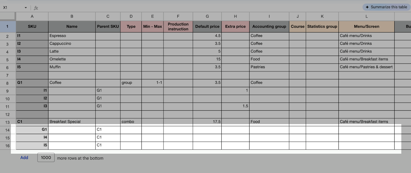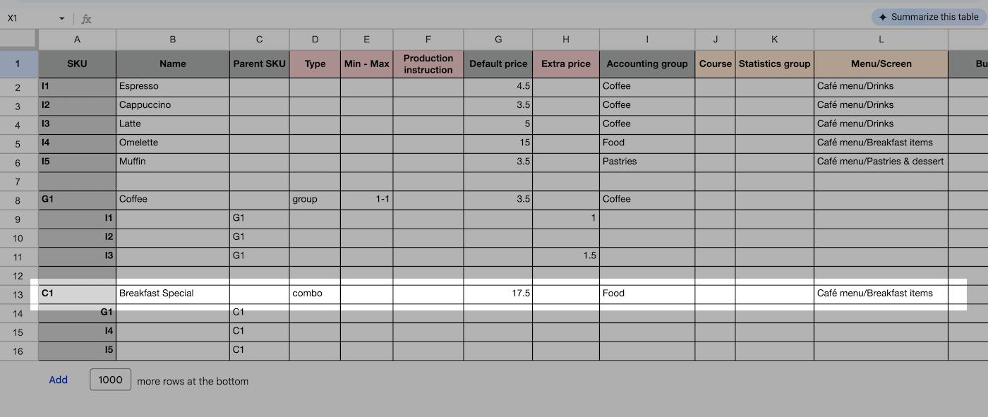 Combo's volgen over het algemeen hetzelfde import- en exportproces als andere typen menu-items. Bij het importeren zijn er echter enkele nuances voor het invoeren van de details van je combo's in het spreadsheetbestand voor import.