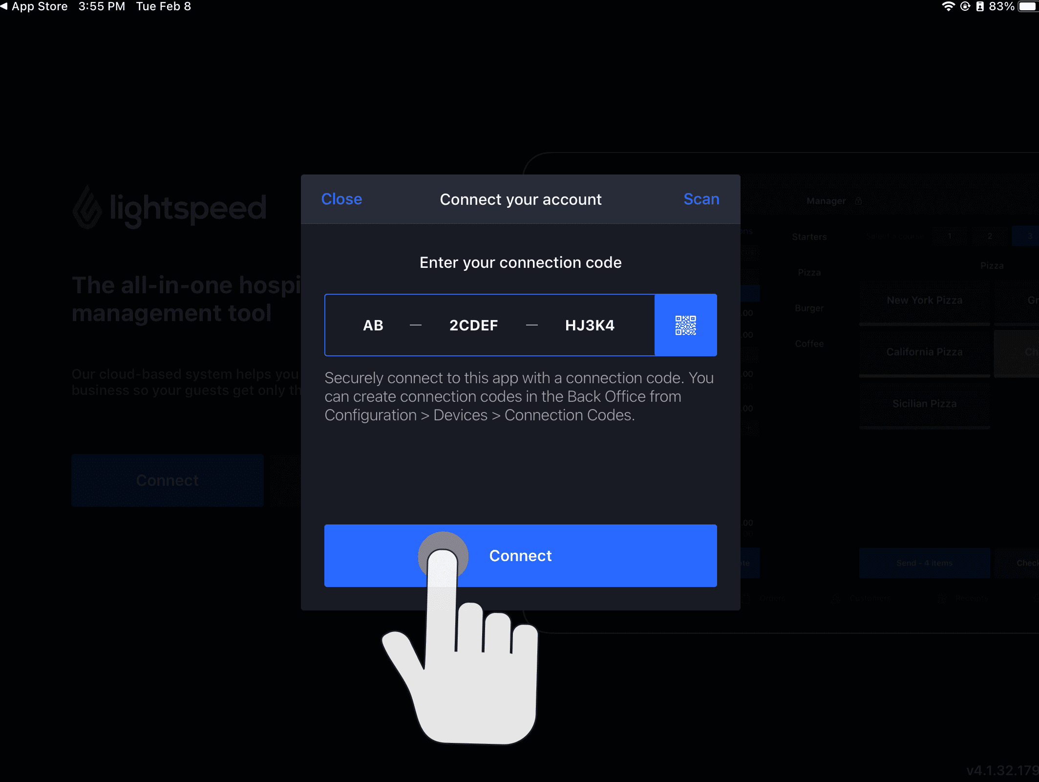 - Open de Lightspeed Restaurant POS-app op de als Keukenscherm dienende iPad en tik op Verbinden.