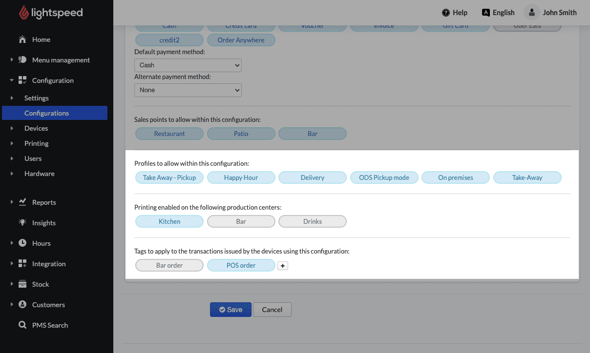 - Selecteer de in stap 3 gemaakte configuratie in het vervolgkeuzemenu Standaard POS-configuratie.
