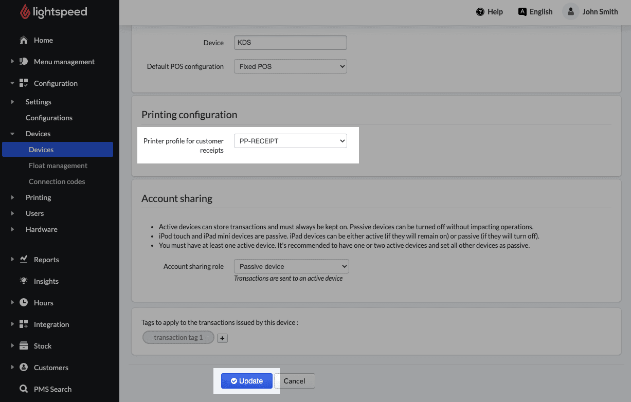 - Selecteer een bestaand printprofiel in het vervolgkeuzemenu Printerprofiel voor klantenbonnen.